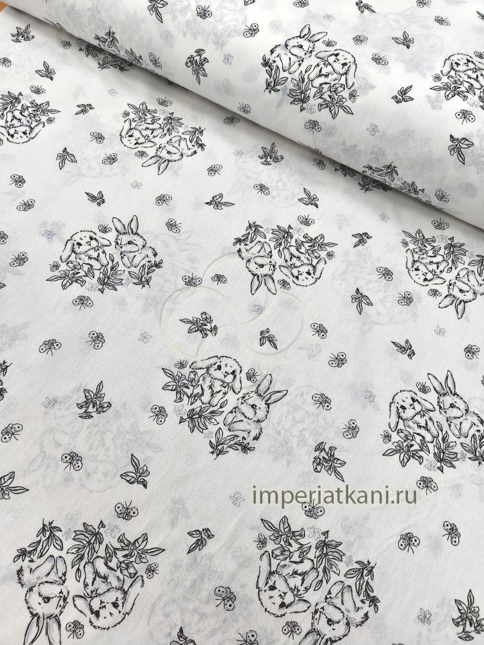 Поплин детский «Зайки в траве» шириной 150 см с изображением на ткани — зайчата, листья; цветовая гамма: серая. Опт от 30 000 руб., продажа рулонами.